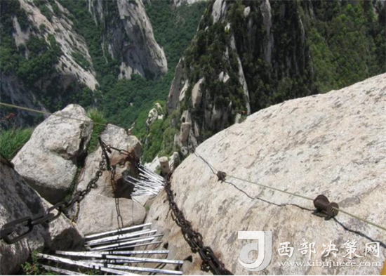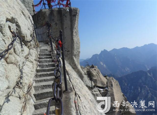 長空棧道位于華山南峰東側(cè)山腰,在約2160米垂直的崖壁上鑿洞、插楔、鋪板搭制而成的“長空棧道”,腳下便是萬丈深淵,勇敢的人如履平地,稍畏懼者便是膽戰(zhàn)心驚,屏氣挪步。