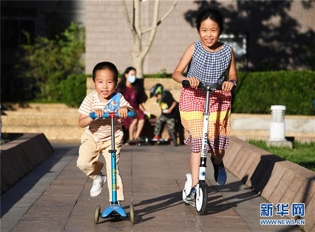 5月31日,在北京市海淀區(qū)中關(guān)村街道新科祥園社區(qū)廣場,小朋友在玩耍。 新華社記者 任超 攝