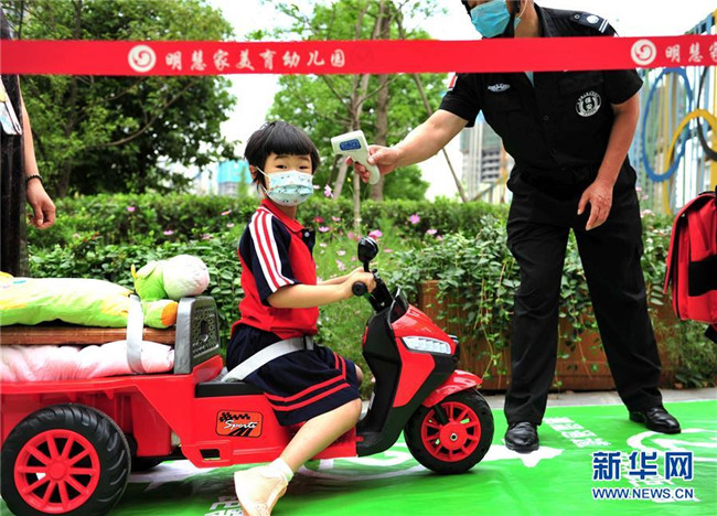 6月2日,成都市龍泉驛區(qū)明慧家美育幼兒園恢復(fù)開園,小朋友們在接受入園體檢。 新華社發(fā)(胥冰潔攝)