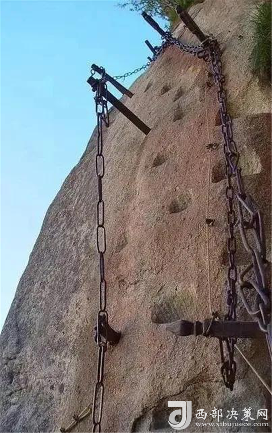華山還有一處常人不敢涉足的險(xiǎn)境--- 鷂子翻身。鷂子翻身在華山東峰是通往下棋亭的必由之路。其路鑿于懸崖上,下視唯見寒索垂于凌空,不見路徑。游人至此,需面壁挽索,以腳尖探尋石窩,交替而下,其中幾步需如鷹鷂一般、左右翻轉(zhuǎn)身體才可通過(guò)。此景只留英雄客,婦孺難聞幾聲咳。這句話現(xiàn)在也未然,巾幗不讓須眉,以后應(yīng)是往來(lái)無(wú)懼者,皆是英雄客了。