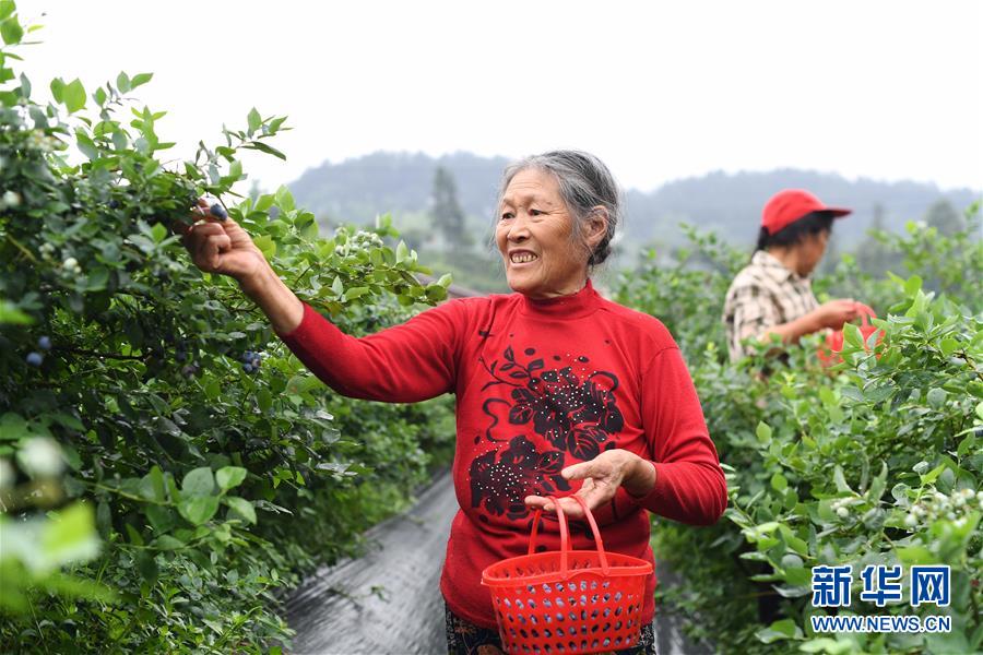 村民在茨竹鎮(zhèn)大面坡村藍桂香園藍莓基地采摘藍莓。新華社記者 王全超 攝