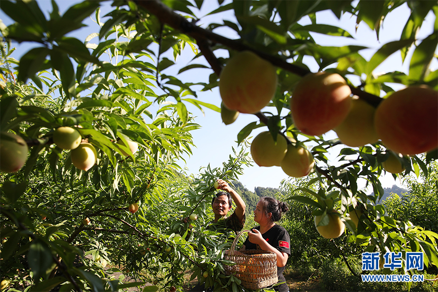 重慶市黔江區(qū)黑溪鎮(zhèn)蘇維村村民龐春武正在采摘桃子。新華網(wǎng)發(fā)(楊敏 攝)