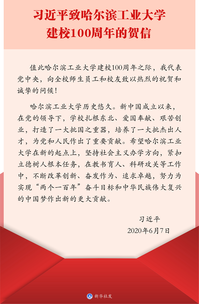 中共中央總書記、國(guó)家主席、中央軍委主席習(xí)近平7日致信祝賀哈爾濱工業(yè)大學(xué)建校100周年,向全校師生員工和校友致以熱烈的祝賀和誠(chéng)摯的問(wèn)候。