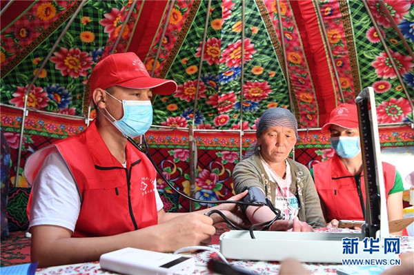 6月20日,新疆阿勒泰地區(qū)布爾津縣也格孜托別鄉(xiāng)克孜勒托蓋村村醫(yī)在布爾津縣黑流灘草原給牧民巴合提古麗·塔拉甫汗檢查身體。圍繞實(shí)現(xiàn)人人享有基本醫(yī)療衛(wèi)生服務(wù)目標(biāo),2016年起,新疆布爾津縣開展家庭醫(yī)生簽約服務(wù)工作。該縣組建家庭醫(yī)生簽約團(tuán)隊(duì)65個(gè),團(tuán)隊(duì)醫(yī)務(wù)人員233名,通過手機(jī)APP、基本公衛(wèi)系統(tǒng)與全縣建檔立卡貧困戶進(jìn)行電子化簽約,提升村醫(yī)隨訪的工作效率和質(zhì)量。截至目前,已完成簽約42936人,履約40043人。新華社記者沙達(dá)提攝