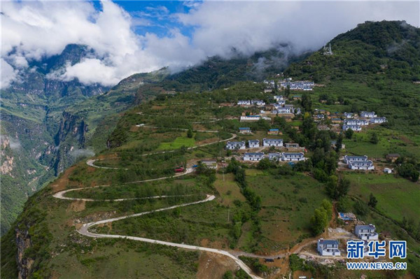 6月24日,懸崖邊的四川省布拖縣拉果鄉(xiāng)布歪村安全住房依山而建錯(cuò)落有致(無人機(jī)照片)。新華社記者江宏景攝