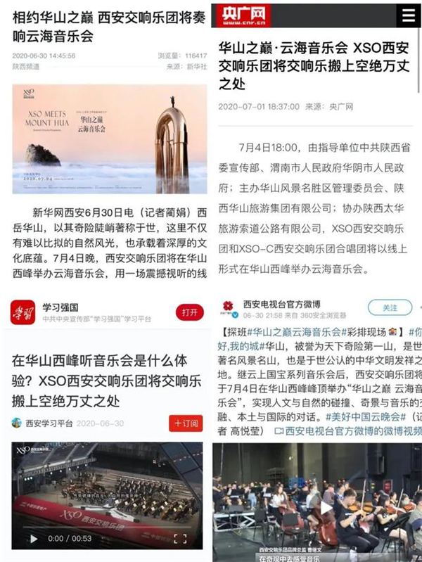 本場華山之巔·云海音樂會通過央視新聞、央視頻、央視音樂、B站、中新網(wǎng)、人民視頻、愛奇藝隨刻、愛滿地古典音樂頻道、西安發(fā)布、西安臺、華商網(wǎng)、西部網(wǎng)、咪咕音樂、焦糖、西影視頻等平臺進(jìn)行了同步播放。全網(wǎng)首輪播放量5千萬+。