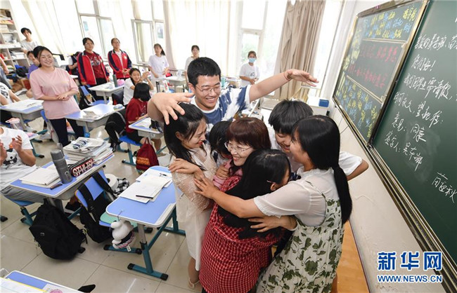 7月6日,吉林省孤兒學(xué)校高三年級(jí)學(xué)生與班主任吳東輝相擁慶祝畢業(yè)。 新華社記者 許暢 攝