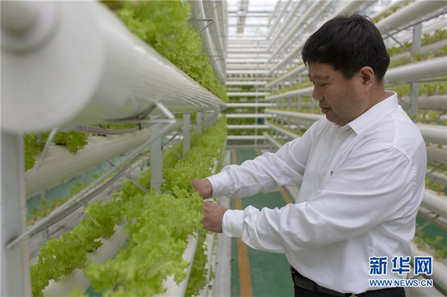 山東省蘭陵縣代村黨委書記王傳喜在查看無土栽培蔬菜長勢(6月18日攝)。新華社記者王陽攝