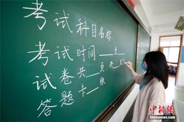 圖為北京十二中老師布置標(biāo)準(zhǔn)考場(chǎng)。 中新社記者 富田 攝