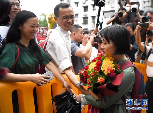 7月8日,一名考生(右)在湖南省長沙市一中考點外從家長手中接過鮮花。 當日,全國部分地區(qū)2020年高考結束。 新華社記者 薛宇舸 攝