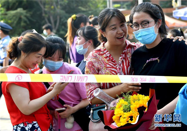 7月8日,吉林省長春希望高中考點的考生接過家長手中的花束。 當日,全國部分地區(qū)2020年高考結束。 新華社記者 張楠 攝