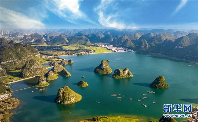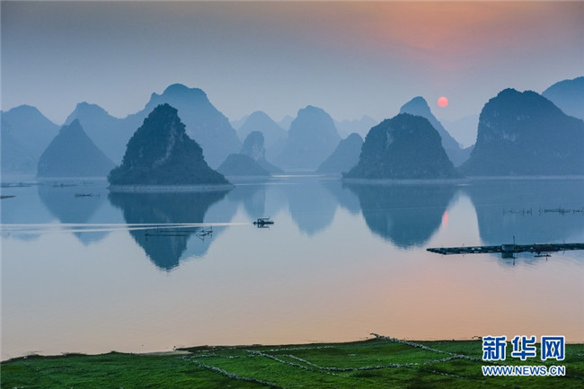 渠洋湖旅游風(fēng)景區(qū)是一個大型喀斯特湖泊,位于廣西靖西市西北方向,總面積近2500公頃,水面煙波浩渺,湖邊翠竹婆娑,湖中獨峰錯落,仿佛“水上小桂林”。