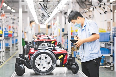 近來,江西省豐城市外貿(mào)企業(yè)通過與電商平臺合作、云推介等方式促進企業(yè)穩(wěn)產(chǎn)增效。圖為豐城市捷和電機(江西)有限公司員工在生產(chǎn)線上組裝電動輪椅車,準備出口至歐洲、中東、非洲等地市場。周 亮攝(人民視覺)