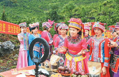7月11日,廣西羅城仫佬族自治縣“仫佬十姐妹”直播團隊在四把鎮(zhèn)集環(huán)村介紹當?shù)剞r(nóng)特產(chǎn)品,通過電商直播“帶貨”,助力脫貧攻堅。韋如代攝(人民視覺)