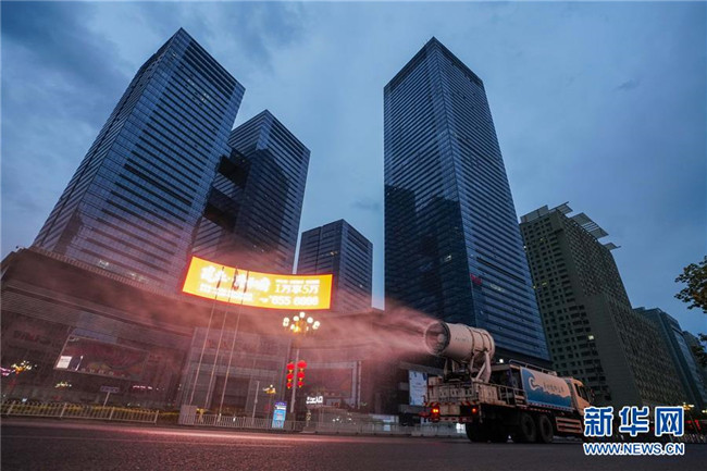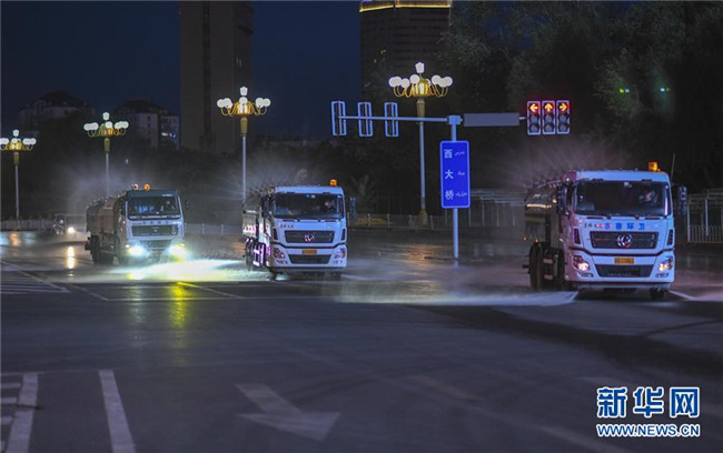 7月20日,烏魯木齊市天山區(qū)城管局清運(yùn)隊(duì)的工作車(chē)輛在市區(qū)光明路進(jìn)行消殺作業(yè)。 新華社記者 趙戈 攝