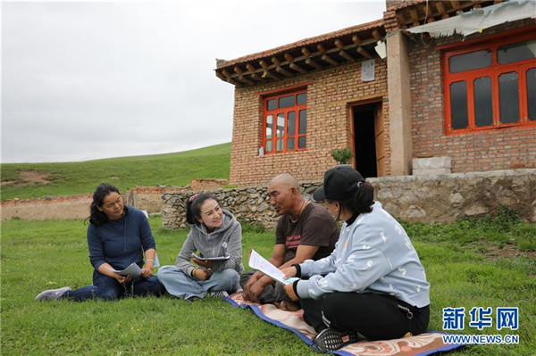7月23日,在甘肅省甘南藏族自治州夏河縣??奇?zhèn)崗岔村,卓瑪吉(左二)和駐村幫扶工作隊(duì)隊(duì)員一起入戶了解村民巴桑一家的生產(chǎn)生活情況。崗岔村是甘肅省甘南藏族自治州夏河縣??奇?zhèn)的一個(gè)牧業(yè)村,平均海拔3000米以上。2018年,在夏河縣文明辦工作的卓瑪吉開(kāi)始擔(dān)任駐村幫扶工作隊(duì)隊(duì)長(zhǎng),每年都有200多天待在草原上。兩年來(lái),卓瑪吉帶領(lǐng)大家開(kāi)辦扶貧車間,發(fā)展特色產(chǎn)業(yè),聯(lián)系勞務(wù)輸出。為了讓村民更全面地了解精準(zhǔn)扶貧政策,卓瑪吉登門宣講政策。為了提高村容村貌,卓瑪吉發(fā)動(dòng)大家開(kāi)展廁所革命和庭院環(huán)境評(píng)比,積極響應(yīng)甘南藏族自治州“全域無(wú)垃圾”創(chuàng)建行動(dòng)。她還從縣城請(qǐng)來(lái)醫(yī)生,為村民舉辦健康講座,在全村婦女中開(kāi)展“兩癌篩查”。如今,崗岔村變成了干凈、整齊、富裕、美麗的生態(tài)文明村,提前實(shí)現(xiàn)了整村脫貧。談起心愿,卓瑪吉說(shuō):“要讓草原和草原上的人都變得更美。”新華社發(fā)(杜哲宇攝)