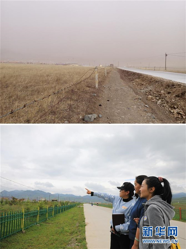 拼版照片:上圖為崗岔村村道綠化改造前的面貌(資料照片)。下圖為7月23日,卓瑪吉(右一)和駐村幫扶工作隊(duì)隊(duì)員站在綠化改造后的崗岔村村道上,謀劃下一步的工作。新華社發(fā)(杜哲宇攝)崗岔村是甘肅省甘南藏族自治州夏河縣??奇?zhèn)的一個(gè)牧業(yè)村,平均海拔3000米以上。2018年,在夏河縣文明辦工作的卓瑪吉開(kāi)始擔(dān)任駐村幫扶工作隊(duì)隊(duì)長(zhǎng),每年都有200多天待在草原上。兩年來(lái),卓瑪吉帶領(lǐng)大家開(kāi)辦扶貧車間,發(fā)展特色產(chǎn)業(yè),聯(lián)系勞務(wù)輸出。為了讓村民更全面地了解精準(zhǔn)扶貧政策,卓瑪吉登門宣講政策。為了提高村容村貌,卓瑪吉發(fā)動(dòng)大家開(kāi)展廁所革命和庭院環(huán)境評(píng)比,積極響應(yīng)甘南藏族自治州“全域無(wú)垃圾”創(chuàng)建行動(dòng)。她還從縣城請(qǐng)來(lái)醫(yī)生,為村民舉辦健康講座,在全村婦女中開(kāi)展“兩癌篩查”。如今,崗岔村變成了干凈、整齊、富裕、美麗的生態(tài)文明村,提前實(shí)現(xiàn)了整村脫貧。談起心愿,卓瑪吉說(shuō):“要讓草原和草原上的人都變得更美。”新華社發(fā)