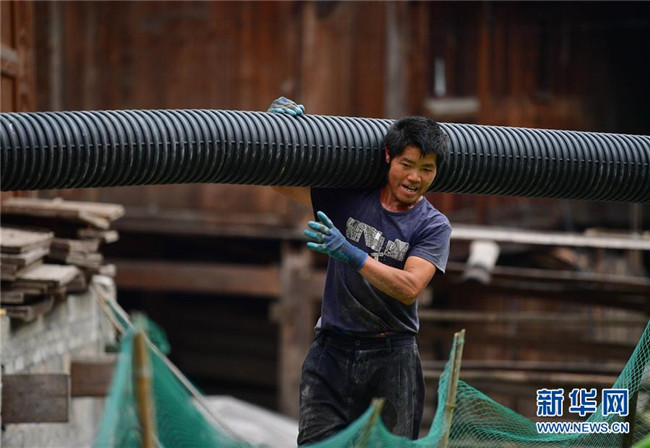 在烏英苗寨,村民在搬運排污管道,準(zhǔn)備鋪設(shè)(7月7日攝)。 新華社記者 黃孝邦 攝
