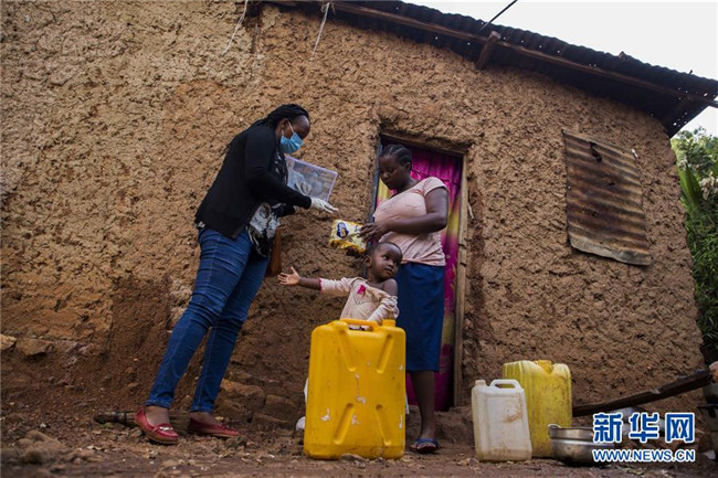 3月28日,在盧旺達首都基加利,一名政府官員(左)將救助物資交給受新冠肺炎管控措施影響的貧困家庭。 新華社發(fā)(西里爾·恩德格亞攝)