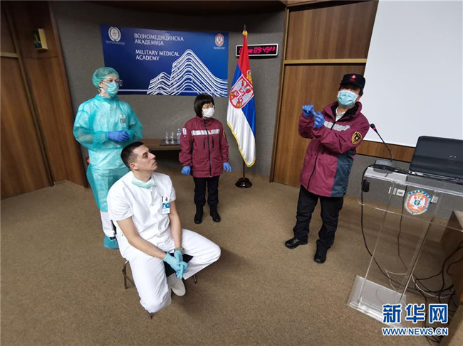 3月28日,中國赴塞爾維亞抗疫醫(yī)療專家組在貝爾格萊德對醫(yī)護人員進行培訓(xùn)時講解標(biāo)本采集。 新華社發(fā)(專家組供圖)