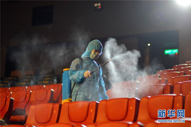 6月26日,馬來西亞吉隆坡一家電影院的工作人員為放映廳消毒。馬來西亞政府允許電影院等場所于7月1日起恢復(fù)營業(yè)。新華社發(fā)(張紋綜攝)