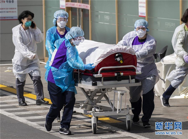3月4日,在韓國大邱慶北大學(xué)醫(yī)院,醫(yī)護人員轉(zhuǎn)送患者。 新華社發(fā)(李相浩攝)