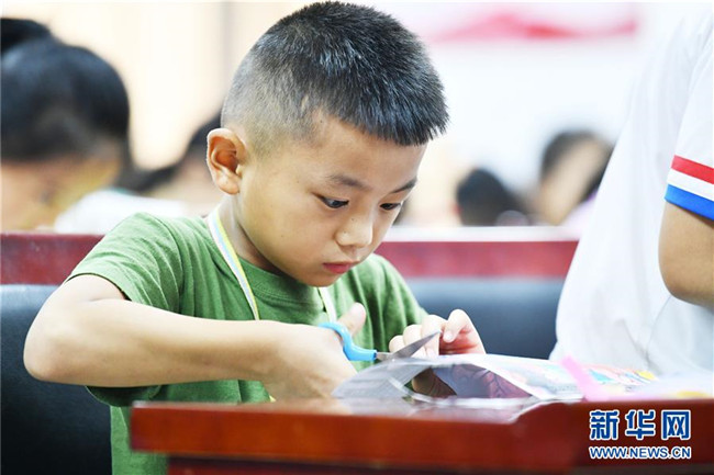 8月13日,貴州省思南縣雙塘街道麗景社區(qū)易地扶貧搬遷安置點的孩子在學(xué)習(xí)剪紙。 新華社記者 楊文斌 攝