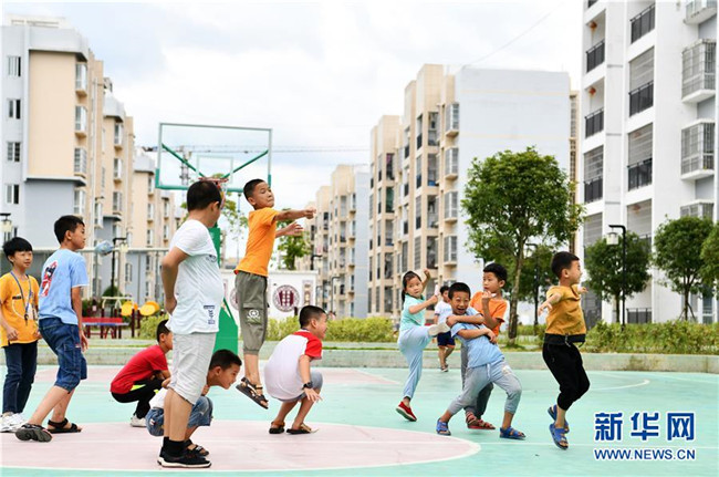 8月13日,在貴州省思南縣雙塘街道麗景社區(qū)易地扶貧搬遷安置點,孩子們和志愿者在丟沙包。新華社記者 楊文斌 攝