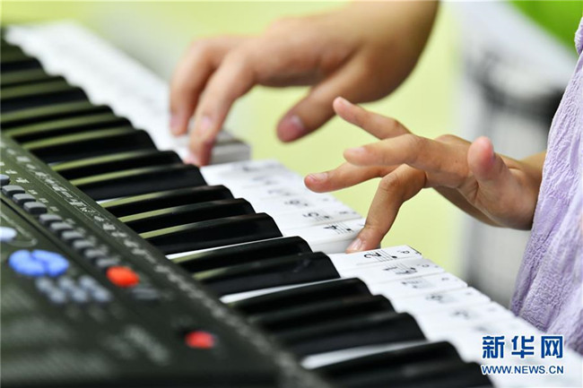 8月13日,在貴州省思南縣雙塘街道麗景社區(qū)易地扶貧搬遷安置點,志愿者在指導(dǎo)孩子學(xué)彈電子琴。 新華社記者 楊文斌 攝