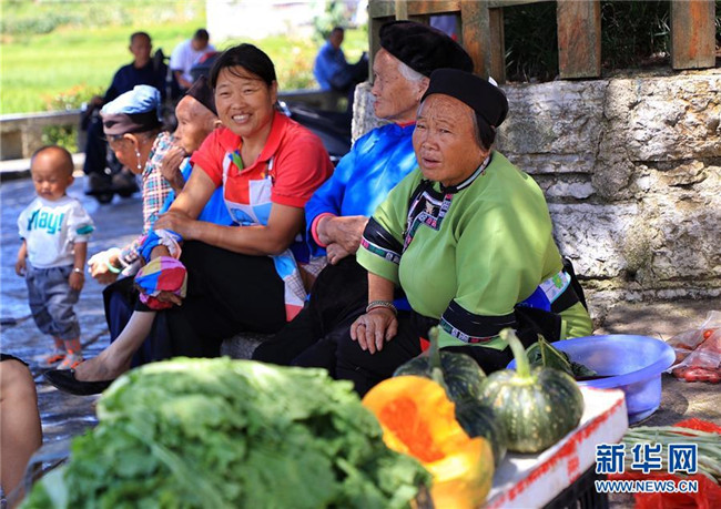 8月25日,在貴州安順鮑家屯,村民在大樹(shù)下乘涼賣菜。新華社記者 劉續(xù) 攝