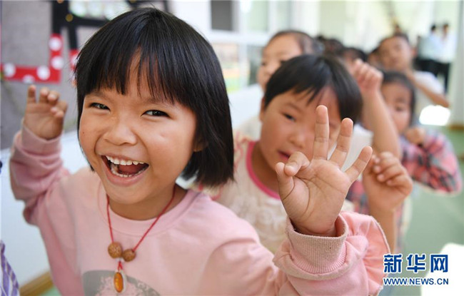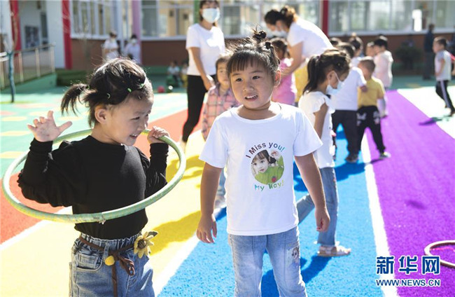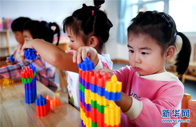 8月25日,在新落成的靈口鎮(zhèn)中心幼兒園里,即將入園的孩子們?cè)谧鲇螒颉P氯A社記者陶明攝