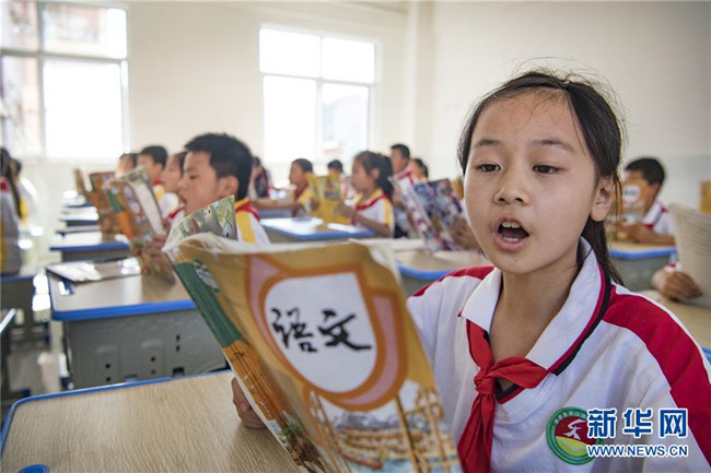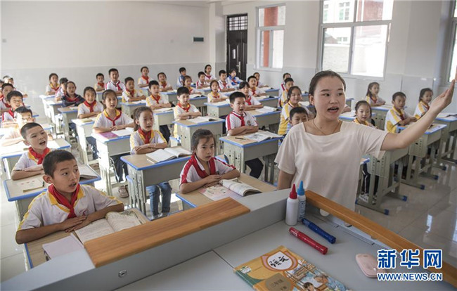 8月25日,靈口鎮(zhèn)中心小學(xué)的孩子們?cè)谛侣涑傻臉?biāo)準(zhǔn)化教室里體驗(yàn)第一堂課。新華社記者陶明攝
