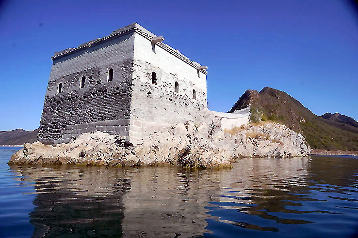 1975年至1981年,為了給天津供水,利用這里的山形地勢(shì),在灤河上游寬城、遷西、興隆三縣交界處,修建了潘家口水庫(kù)。引灤入津工程橫切長(zhǎng)城,喜峰口、潘家口兩座雄關(guān)鑲?cè)胍惶侗滩?,從而形成萬里長(zhǎng)城一處絕景——“水下長(zhǎng)城”。