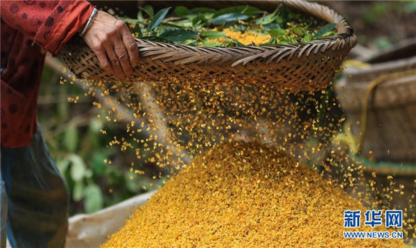 9月24日,四川省瀘州市江陽區(qū)鄰玉街道天堂村的村民在運送打收的桂花。金秋時節(jié),四川省瀘州市江陽區(qū)鄰玉街道天堂村的村民們忙著打收桂花,制作桂花糕等美食,迎接中秋佳節(jié)的到來。新華社發(fā)(劉學懿攝)