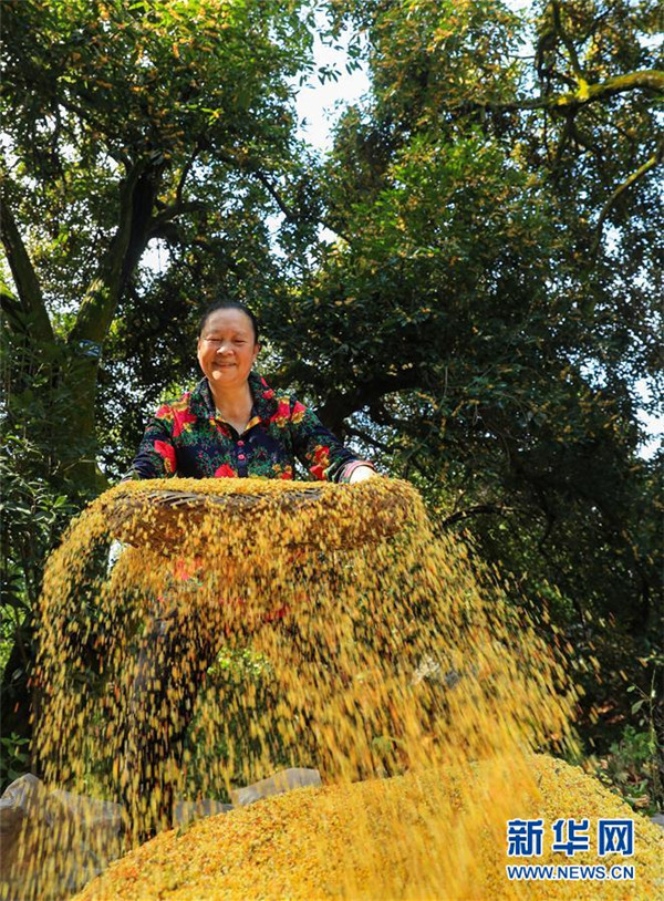 9月24日,四川省瀘州市江陽區(qū)鄰玉街道天堂村的村民在打收桂花。金秋時節(jié),四川省瀘州市江陽區(qū)鄰玉街道天堂村的村民們忙著打收桂花,制作桂花糕等美食,迎接中秋佳節(jié)的到來。新華社發(fā)(劉學懿攝)