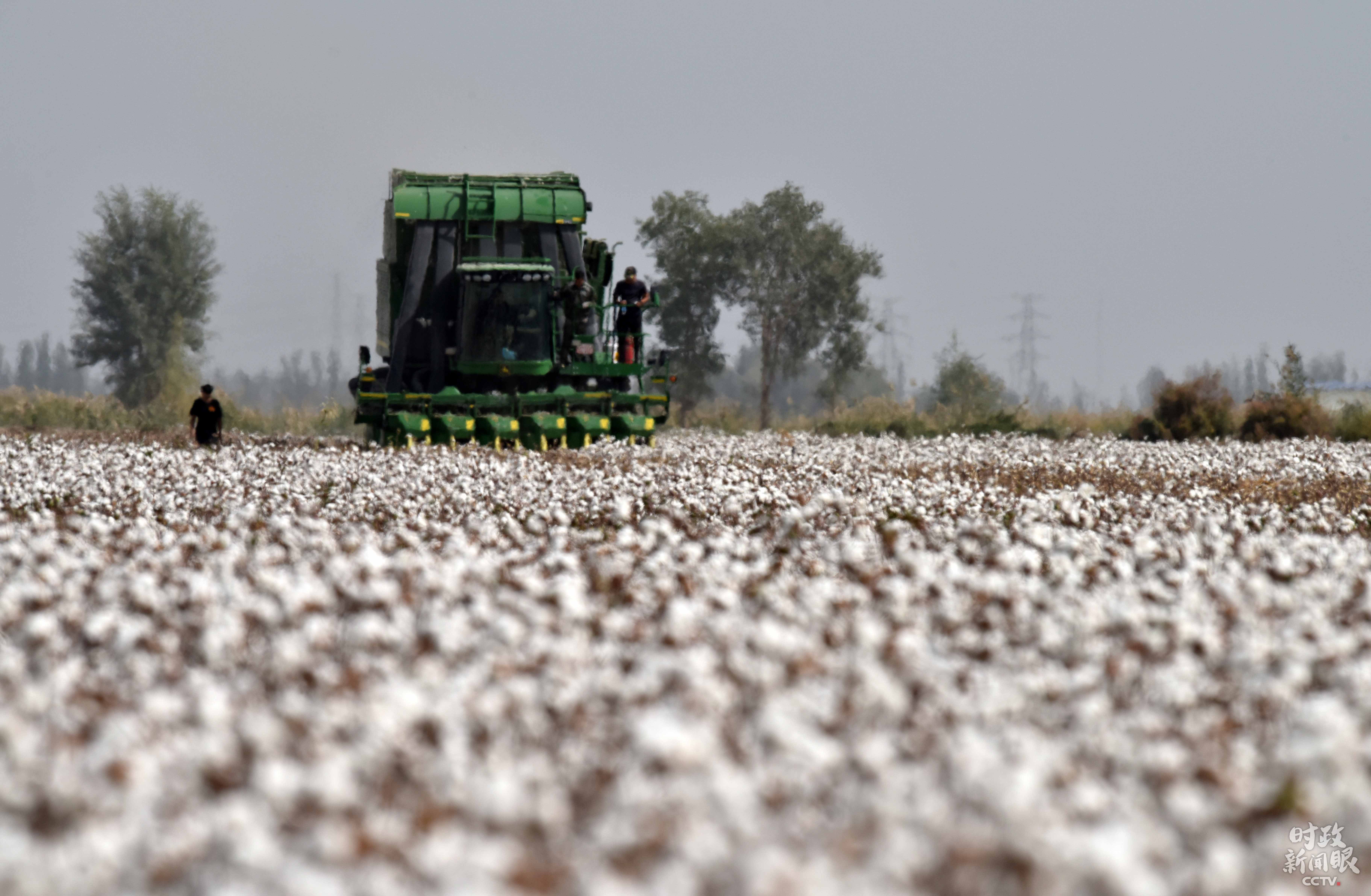 △新疆庫爾勒市普惠農場內,大型采棉機正在采收棉花。