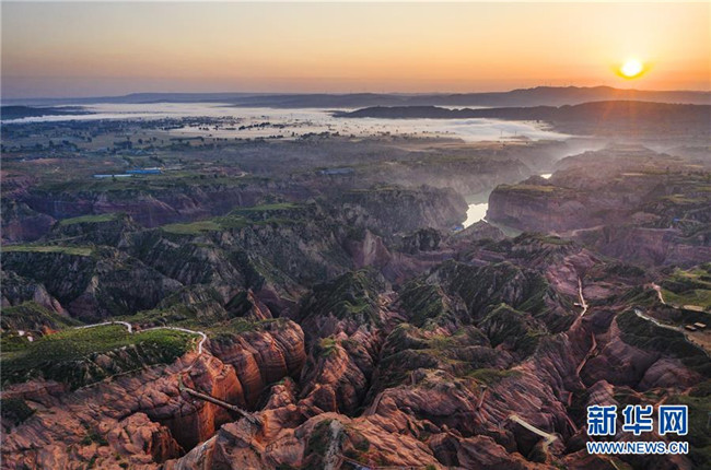 一輪紅日照耀著靖邊縣龍洲鎮(zhèn)波浪谷丹霞景區(qū)(9月24日攝,無人機(jī)照片)。新華社記者 陶明 攝