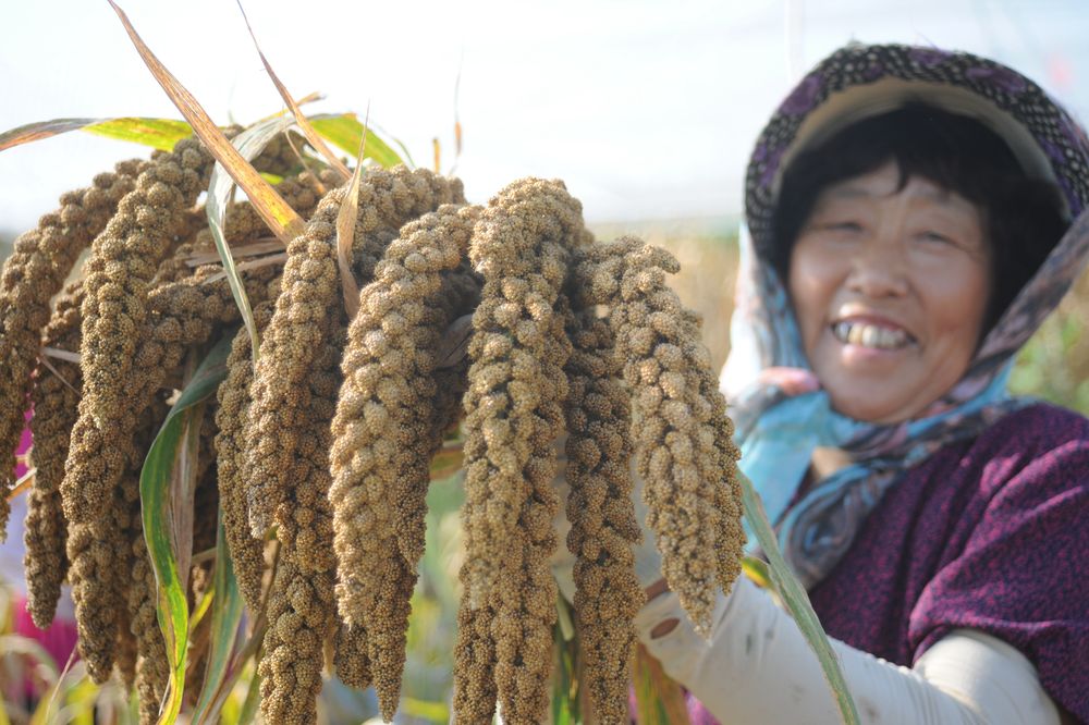 9月22日,山東省煙臺市福山區(qū)老官莊村農民展示剛剛收獲的無公害谷子。新華社發(fā)(申吉忠 攝)