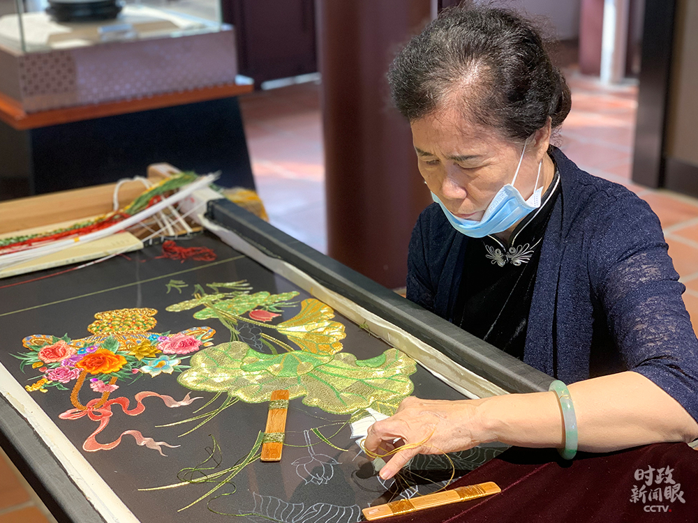 △目前廣濟(jì)樓樓內(nèi)一、二樓分別辟為“潮州通史展”和“潮州非物質(zhì)文化遺產(chǎn)陳列展”展廳。這是潮州刺繡。(總臺央視記者郭晗光拍攝)