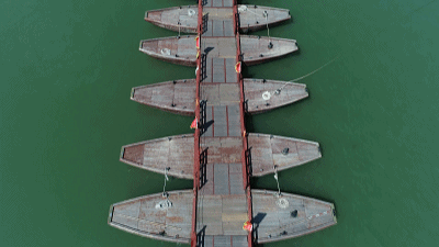 廣濟(jì)橋東西兩邊分別有12個和8個橋墩,中間是18艘木船連成浮橋。正常通航時,木船閉合,行人從橋上經(jīng)過,過往船只從兩邊的橋墩間穿行。汛期洪水泛濫時,則將木船解開,既方便船只通過,也方便排水入海,這就是啟閉式的作用。