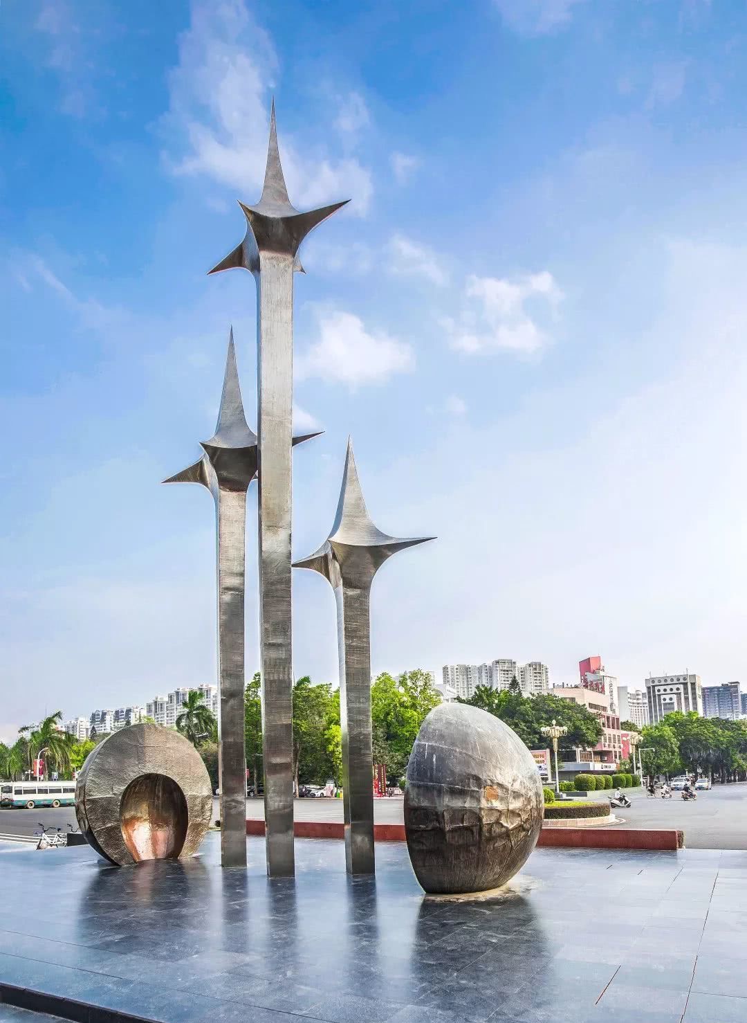 △汕頭的標(biāo)志性雕塑《升騰》,三根頂部鑲有星星標(biāo)志的金屬桿錯(cuò)落有致,高聳挺拔,寓意汕頭發(fā)展日日上升。(資料圖)