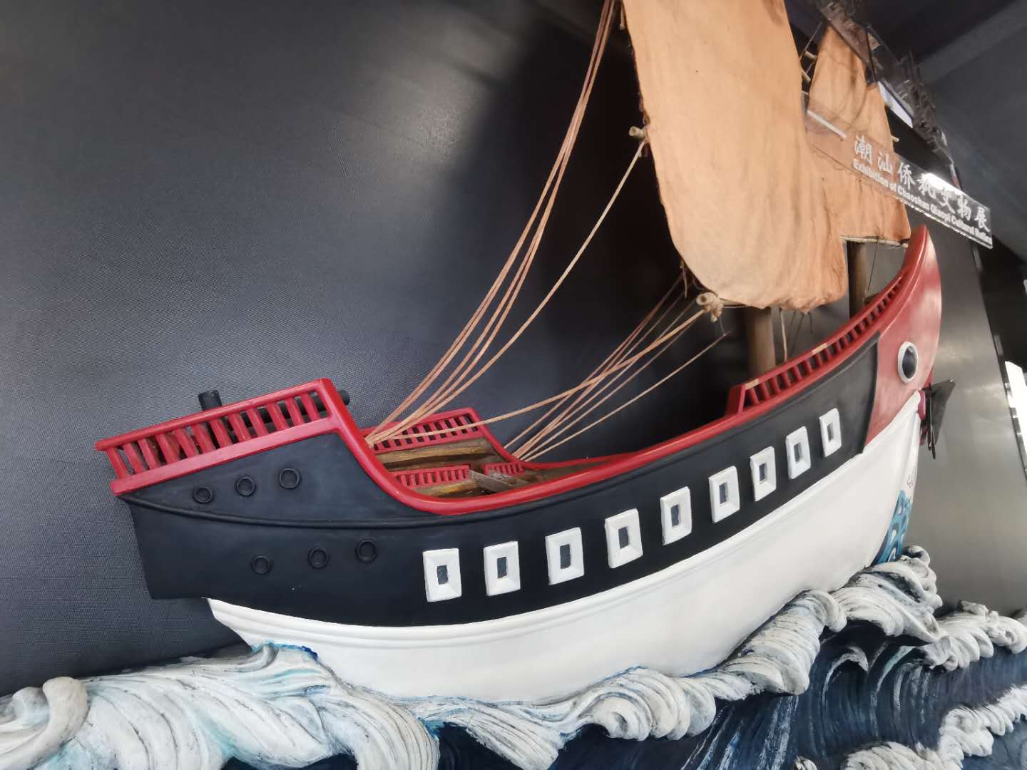 △當(dāng)年潮汕人到海外謀生,出洋所乘的是這種高桅桿的紅頭船。如今紅頭船已成為潮汕人“團(tuán)結(jié) 拼搏 拓展 創(chuàng)新”的精神象征。(總臺(tái)央視記者楊波拍攝)