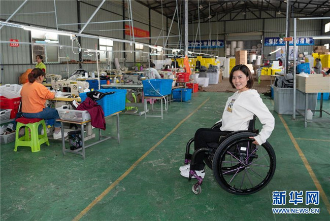 10月13日,殘疾女青年楊淑亭在湖南省邵陽市城步縣自己開辦的湖南七七科技股份有限公司生產(chǎn)車間里。1991年出生的苗族姑娘楊淑亭因車禍胸部以下高位截癱,通過不斷學(xué)習(xí)摸索,開辦網(wǎng)店并注冊了自己的企業(yè),與周邊貧困家庭簽訂合作協(xié)議,制作售賣具有民族特色的背包和仿真花卉,帶動(dòng)上千名貧困人員及59名殘疾人就業(yè)。