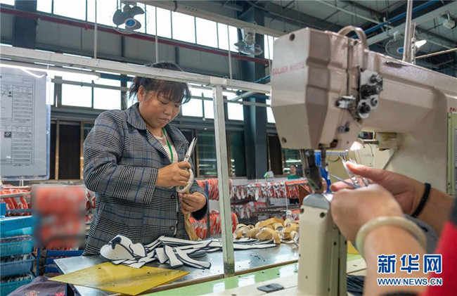 10月12日,在湖南省邵陽市聯(lián)泰鞋業(yè)有限公司,裝有假肢的殘疾人麻玉美在生產(chǎn)線上工作。