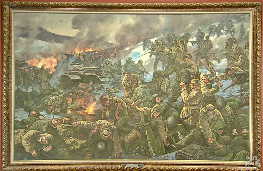 △重現(xiàn)激戰(zhàn)松骨峰場景的油畫(總臺(tái)央視記者石丞拍攝)