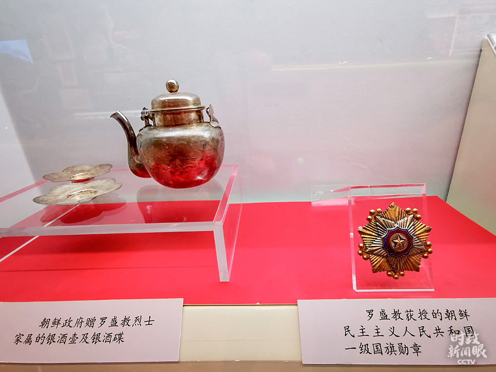 △左為朝鮮政府贈(zèng)給羅盛教烈士家屬的銀酒壺、銀酒碟,右為羅盛教獲授的朝鮮民主主義人民共和國一級國旗勛章。
