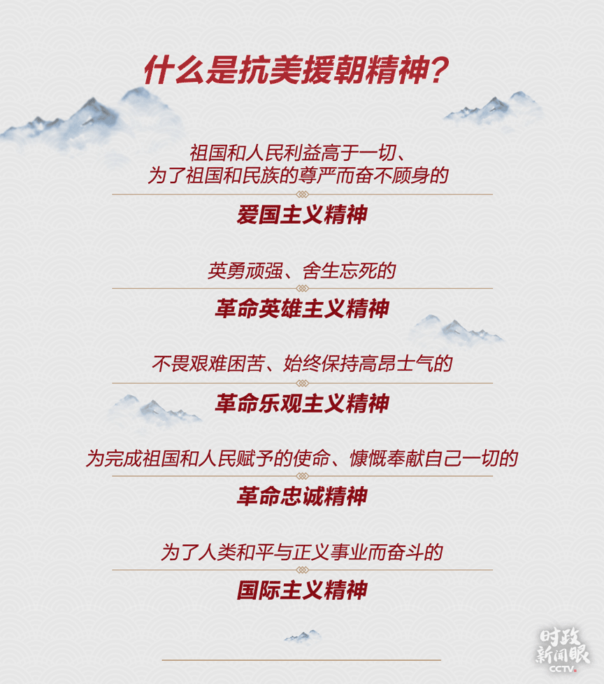 習(xí)近平說,偉大的抗美援朝精神,是中國共產(chǎn)黨人和人民軍隊(duì)崇高風(fēng)范的生動(dòng)寫照,是中華民族傳統(tǒng)美德和民族品格的集中展示,是以愛國主義為核心的民族精神的具體體現(xiàn)。