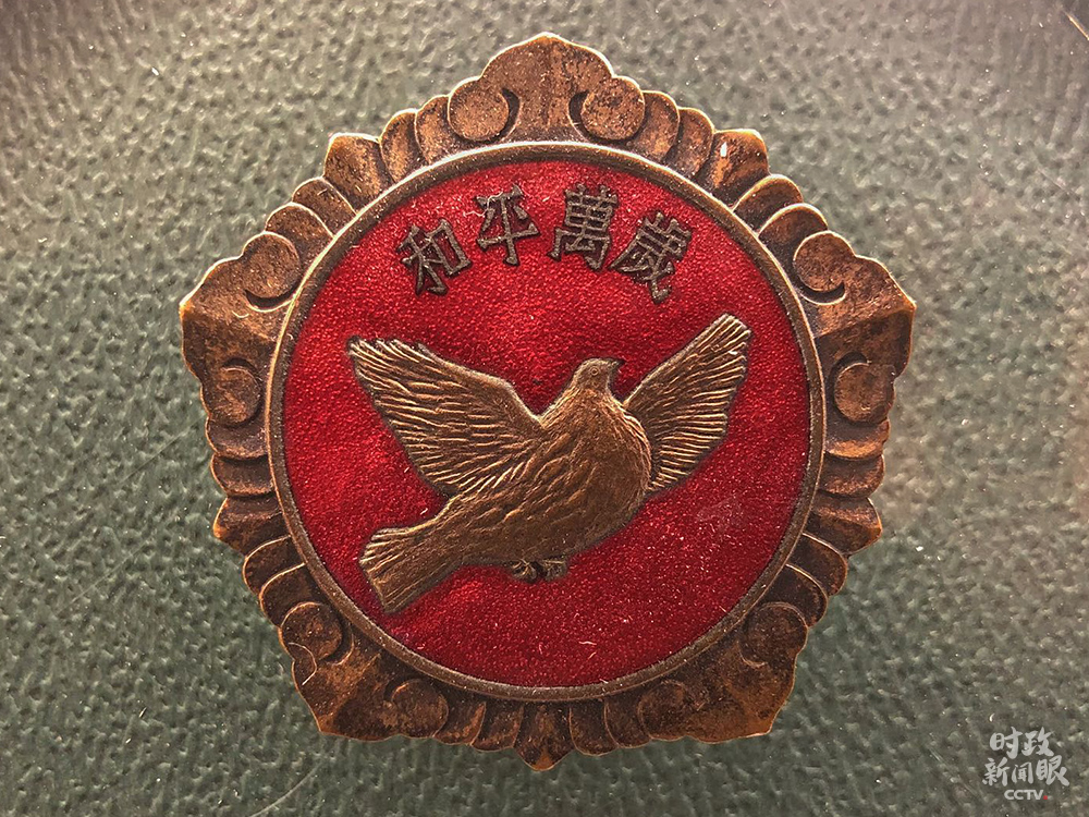 △這是第三屆赴朝慰問團(tuán)贈(zèng)給志愿軍的和平萬歲紀(jì)念章。(總臺(tái)央視記者許永松拍攝)