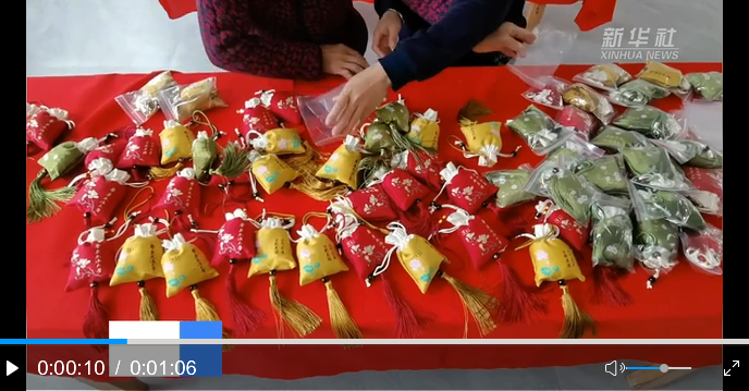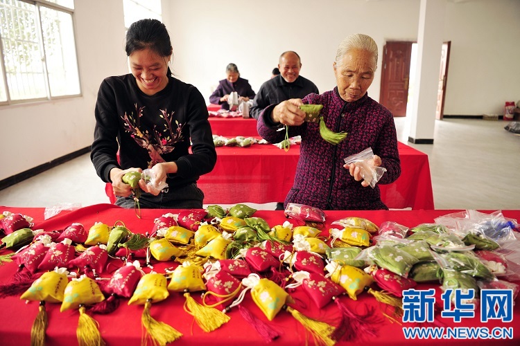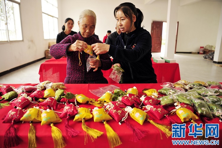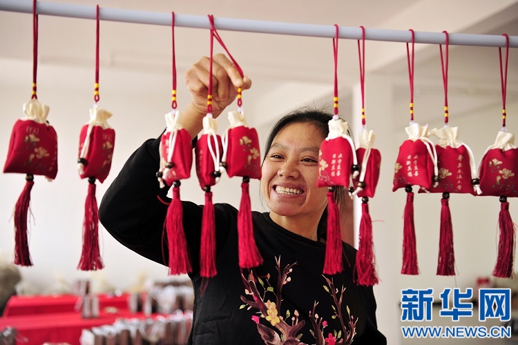 10月19日,在黃茅鎮(zhèn)軍屯村扶貧車間,村民在制作迷迭香袋。新華網(wǎng)發(fā) 鄧龍華 攝