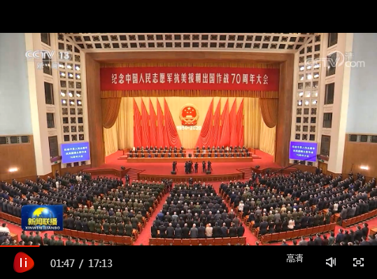 紀(jì)念中國人民志愿軍抗美援朝出國作戰(zhàn)70周年大會23日上午在北京人民大會堂隆重舉行。中共中央總書記、國家主席、中央軍委主席習(xí)近平在會上發(fā)表重要講話強(qiáng)調(diào),偉大的抗美援朝戰(zhàn)爭,抵御了帝國主義侵略擴(kuò)張,捍衛(wèi)了新中國安全,保衛(wèi)了中國人民和平生活,穩(wěn)定了朝鮮半島局勢,維護(hù)了亞洲和世界和平。回望70年前偉大的抗美援朝戰(zhàn)爭,進(jìn)行具有許多新的歷史特點的偉大斗爭,瞻望中華民族偉大復(fù)興的光明前景,我們無比堅定、無比自信。我們要銘記抗美援朝戰(zhàn)爭的艱辛歷程和偉大勝利,弘揚偉大抗美援朝精神,雄赳赳、氣昂昂,向著全面建設(shè)社會主義現(xiàn)代化國家新征程,向著實現(xiàn)中華民族偉大復(fù)興的中國夢繼續(xù)奮勇前進(jìn)。
